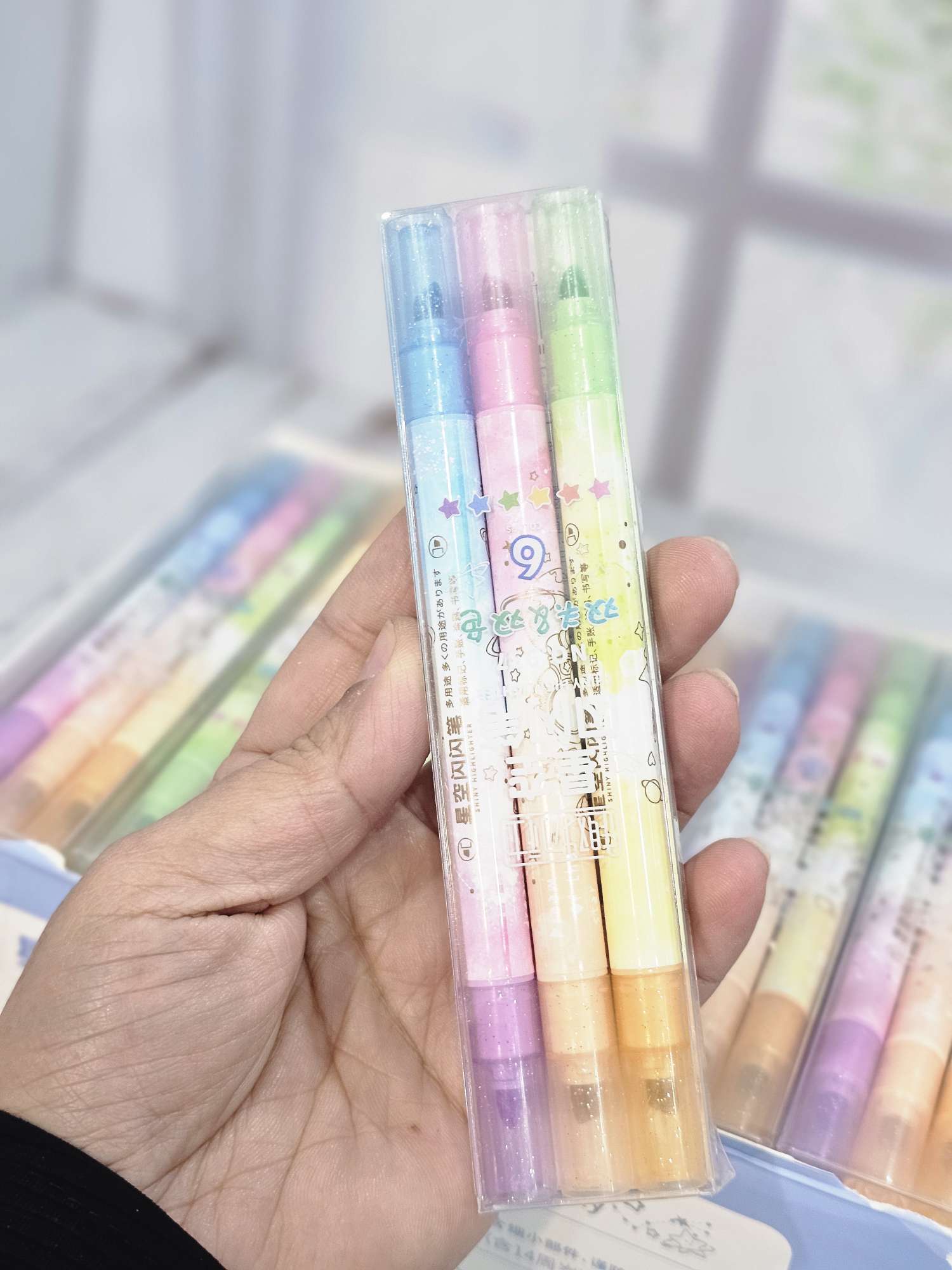 بسته شامل ۳عدد ماژیک هایلایت دوسر میباشد که مجموعا شش رنگ دارد هر طرف ماژیک اکلیلی یک رنگ دارد
